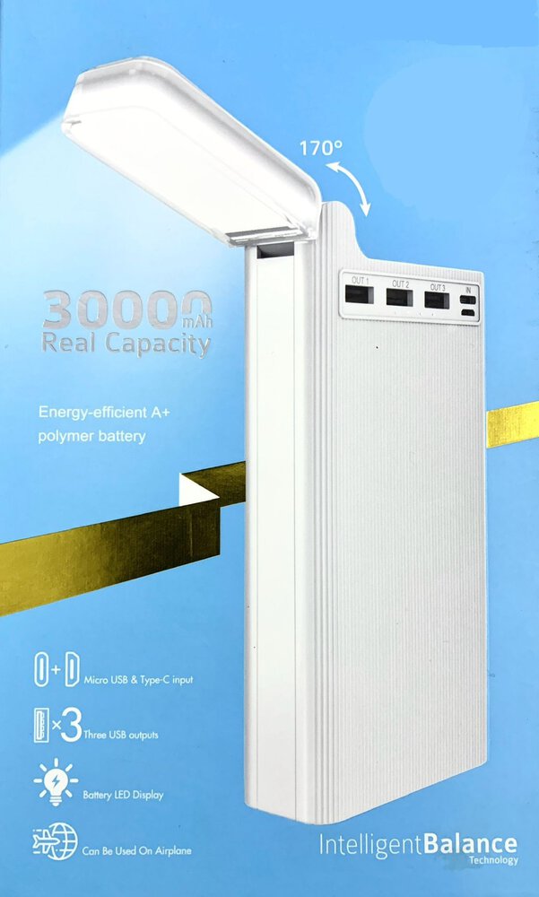 Baterie externa Premium 30.000mAh, 3x USB-A, incarcare wireless 10W, lampa LED