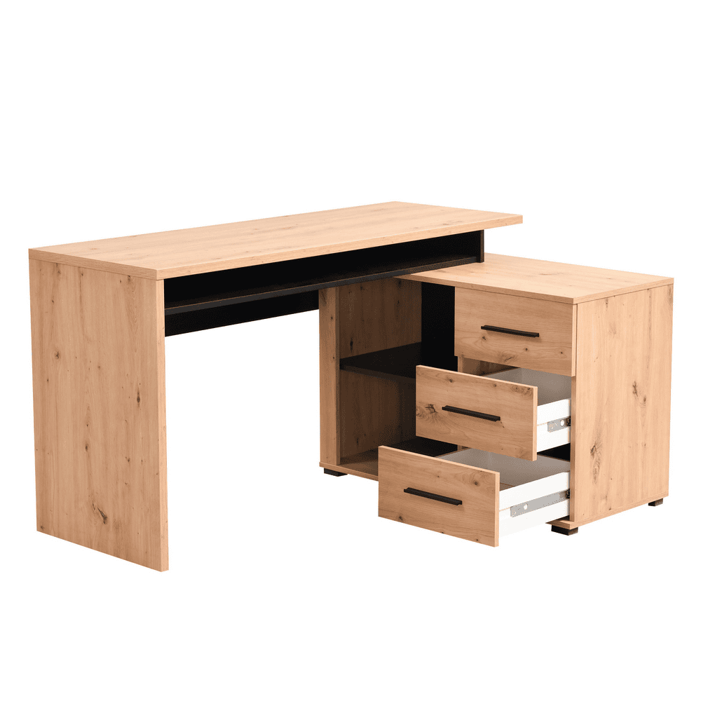 Birou DacEnergy©, realizat din PAL melaminat cu finisaj stejar artisan si negru, pe colt, 3 sertare, 3 rafturi, 137.5 x 75 x 101.5 cm