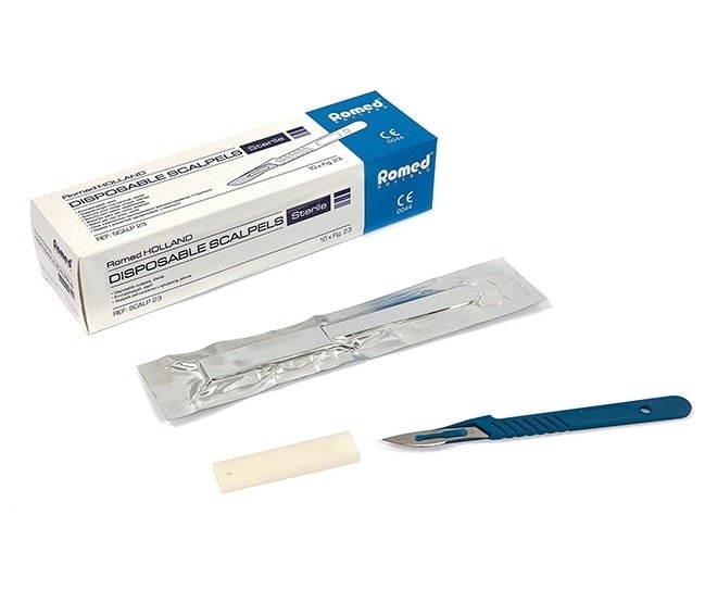 Cu lama de oțel-carbon, bisturiul de unica folosință ROMED garantează un nivel ridicat de sterilizare pentru fiecare utilizare.