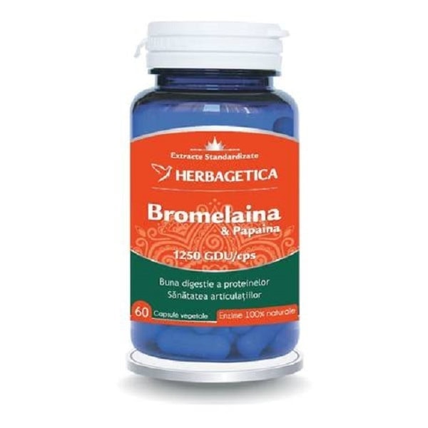 - Produsul Bromelaina&Papaina contine enzime digestive 100% naturale dedicate pentru digestia corecta si completa a proteinelor din alimente: Bromelaina 1250 GDU/capsula extrasa din Ananas si Papaina 40.000 TU/capsula extrasa din Papaya.