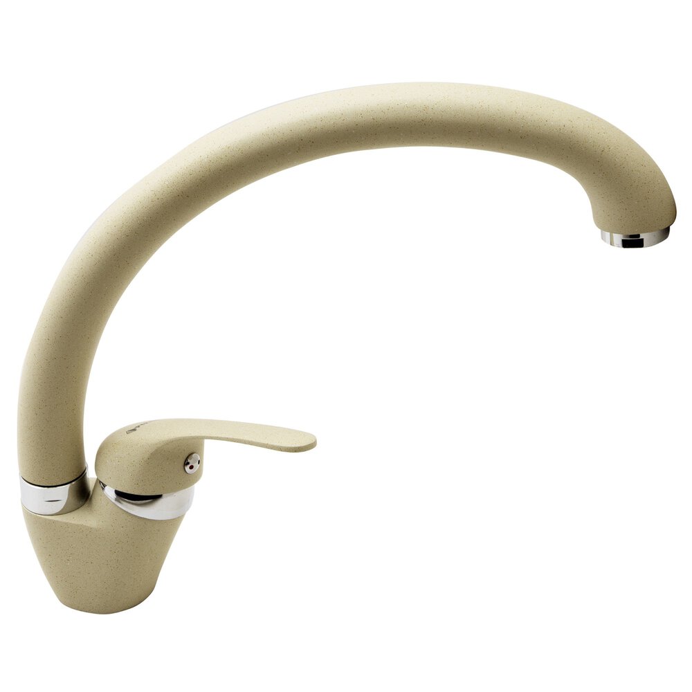 Bateria acestui set dispune de un design elegant, ce se potriveste atat in bucatariile traditionale, precum si in cele moderne. Materialul este compozit de culoare crem. Cartusul cu disc ceramic asigura o functionarea fiabila si o durata lunga de viata. Robinetul bateriei este de tip monocomanda si pipa este lunga.