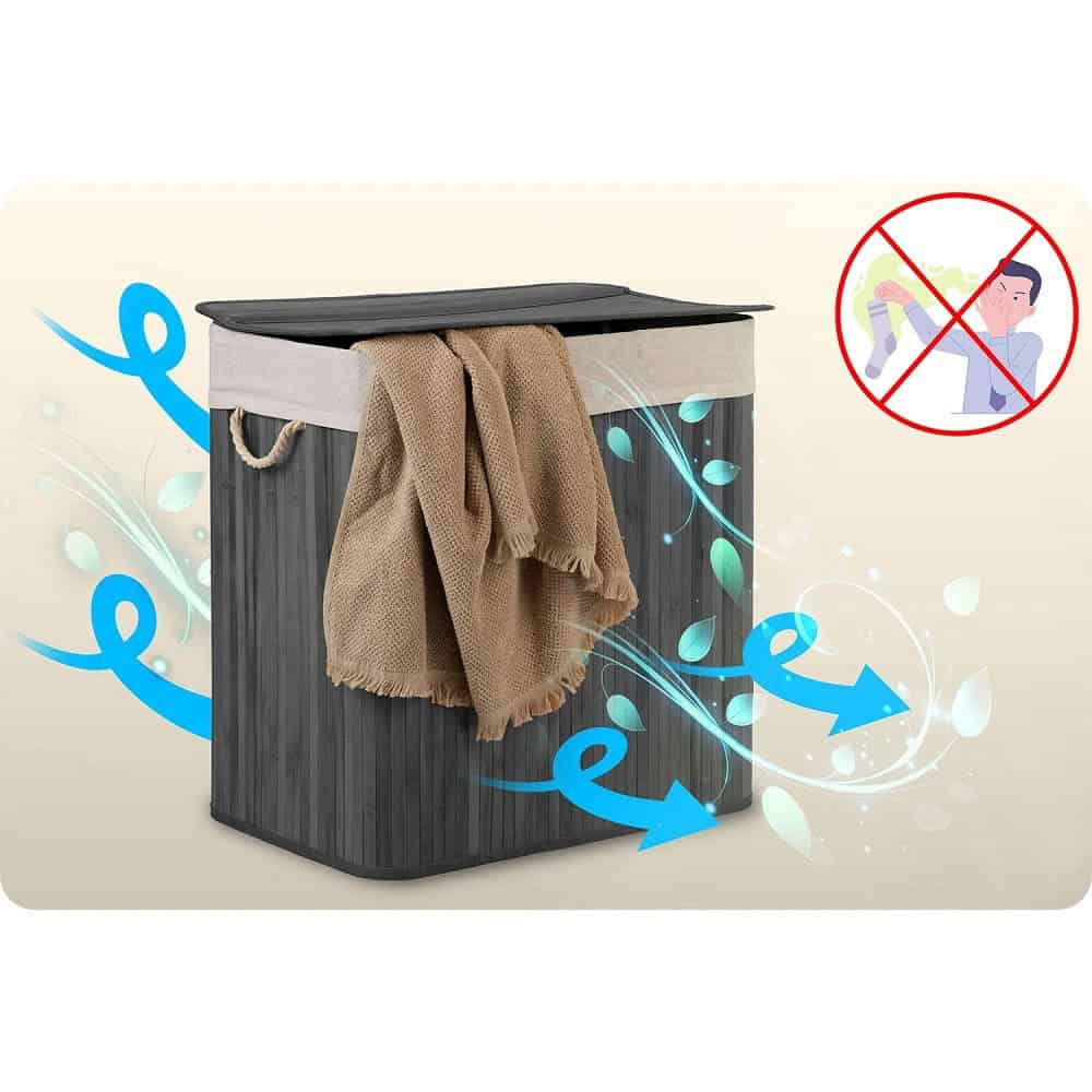 Fibrele naturale de bumbac si bambus absorb activ umezeala si neutralizeaza mirosurile neplacute, fara a le retine in interiorul cosului.