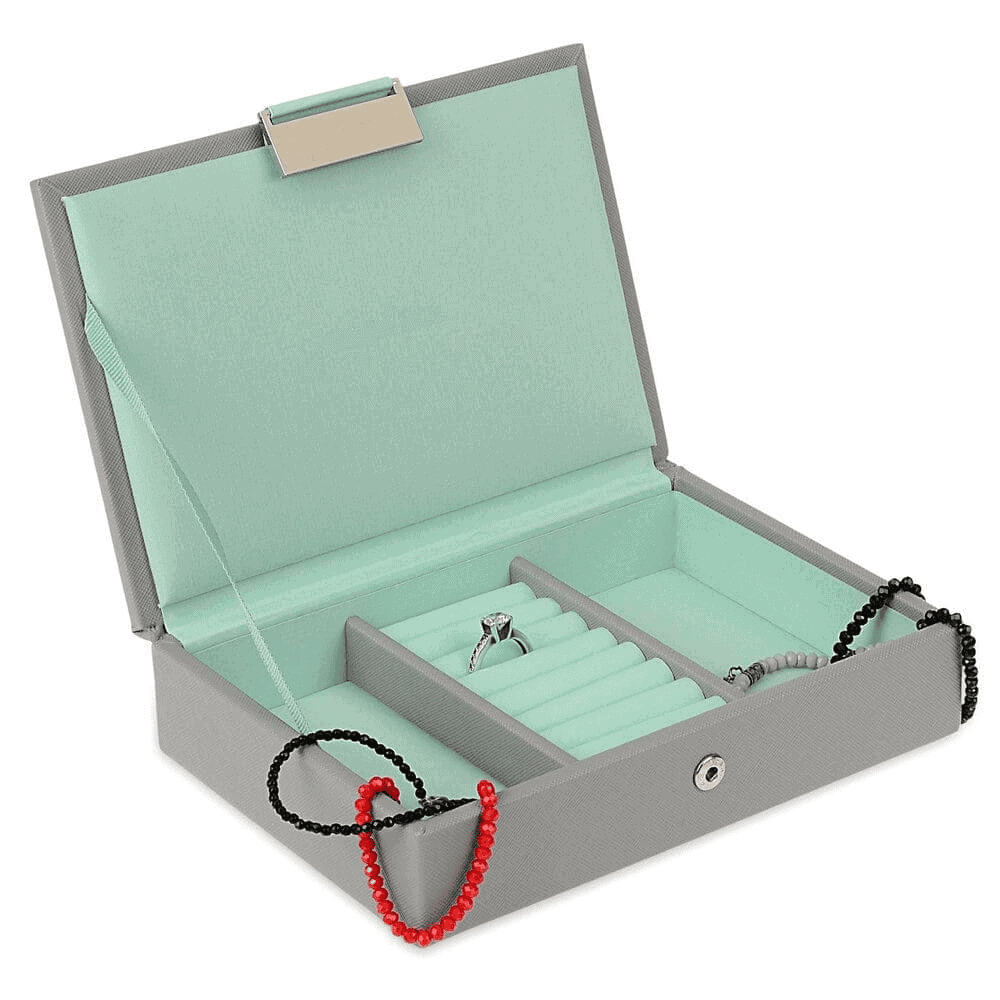 Cutia de bijuterii va permite sa pastrati bijuteriile voastre preferate intr-un loc special creat pentru ele. Aceasta este compartimentata cu multe spatii pentru a va organiza practic si eficient inelele, bratarile, cerceii si lantisoarele. In plus, are posibilitatea de a adauga spatii suplimentare pentru bijuteriile noi datorita compartimentelor din aceeasi gama care sunt realizate pe aceleasi dimensiuni. Astfel, aveti posibilitatea de a combina dupa preferinte si necesitati colectia voastra. Cutia este realizata din imitatie piele si are o cromatica placuta, in nuante de gri si verde. De asemenea, este ideala si pentru a fi facuta cadou persoanelor dragi.