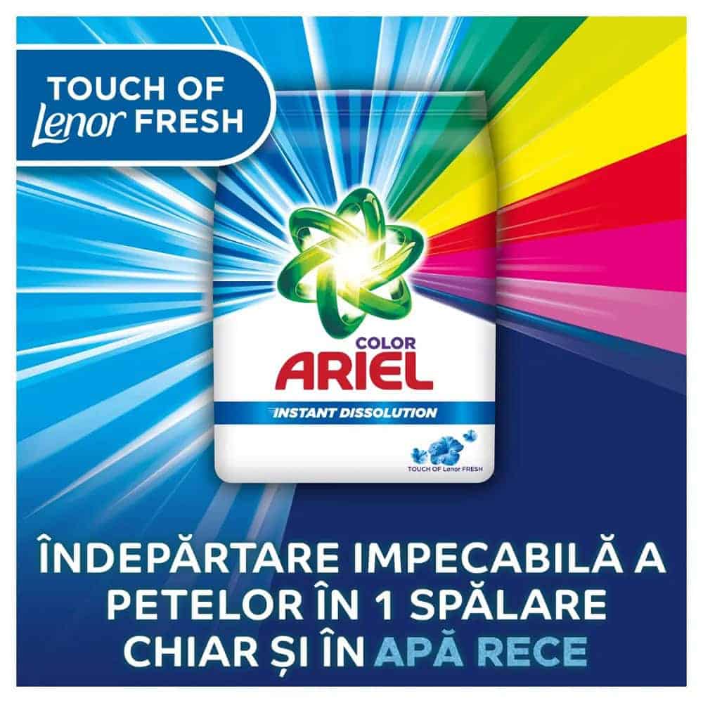 Acum, cu ajutorul formulei sale concentrate, detergentul pudra Ariel Touch of Lenor Fresh asigura o putere de curatare mai mare si spala mai multe rufe per kilogram, indepartand impecabil petele dintr-o singura spalare, protejand totodata culorile. Datorita tehnologiei unice de dizolvare instanta, pudra se dizolva rapid in contact cu apa si patrunde adanc in fibre, chiar si in ciclurile de spalare in apa rece.