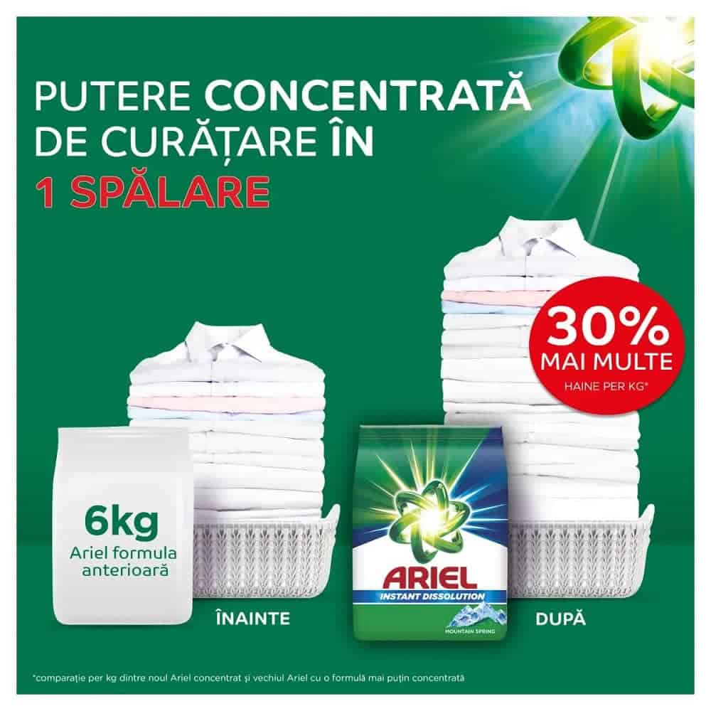 Acum, cu ajutorul formulei sale concentrate, detergentul pudra Ariel Mountain Spring asigura o putere de curatare mai mare si spala mai multe rufe per kilogram, indepartand impecabil petele dintr-o singura spalare, protejand totodata culorile. Datorita tehnologiei unice de dizolvare instanta, pudra se dizolva rapid in contact cu apa si patrunde adanc in fibre, chiar si in ciclurile de spalare in apa rece.