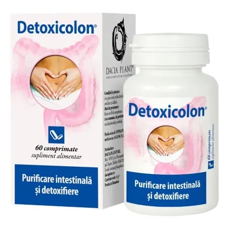 Detoxicolon 60 comprimate Dacia Plant Detoxicolon – Comprimate pentru Detoxifierea Colonului și Tranzit IntestinalDetoxicolon Comprimate este un supliment alimentar sub formă practică de tablete, conceput pentru a susține procesul natural de detoxifiere a colonului și a susține o digestie echilibrată. Formula este bazată pe un complex de plante și extracte, atent dozate pentru eficiență și confort digestiv. ✅ Beneficii cheieSusține eliminarea toxinelor și a reziduurilor din intestin prin acțiune mecanică ușoară.Reglează tranzitul intestinal, ajutând la ameliorarea constipației. Ameliorează senzația de disconfort, balonare și presiune abdominală. Favorizează senzația de sațietate, fiind un aliat în curele de detox și menținerea greutății. Contribuie la echilibrul florei intestinale și la protecția mucoasei gastrointestinale. Compoziție și dozajExtract din plante atent selectate pentru efect sinergic asupra digestiei și detoxifierii.Comprimatele au consistență sură, plăcută la gust. Mod de administrare: Adulți și tineri (15+ ani): 1 comprimat pe zi, cu 30–60 minute înainte de masă. În cazuri particulare (transit întârziat), pot fi administrate 1–2 comprimate, de 2–3 ori pe zi. Durata curei recomandate: 21 de zile, repetabilă de 2–4 ori pe an, cu pauze. ⚠️ Precauții și contraindicațiiA nu se utiliza în cazuri de afecțiuni digestive severe (boli inflamatorii intestinale, sindrom de colon iritabil, apendicită acută), sarcină sau alăptare. Poate interfera cu absorbția unor medicamente; se recomandă administrarea comprimatelor cel puțin 30 de minute înainte de administrarea altor pastile. La apariția disconfortului abdominal (crampe, balonare, diaree), doza trebuie redusă.
