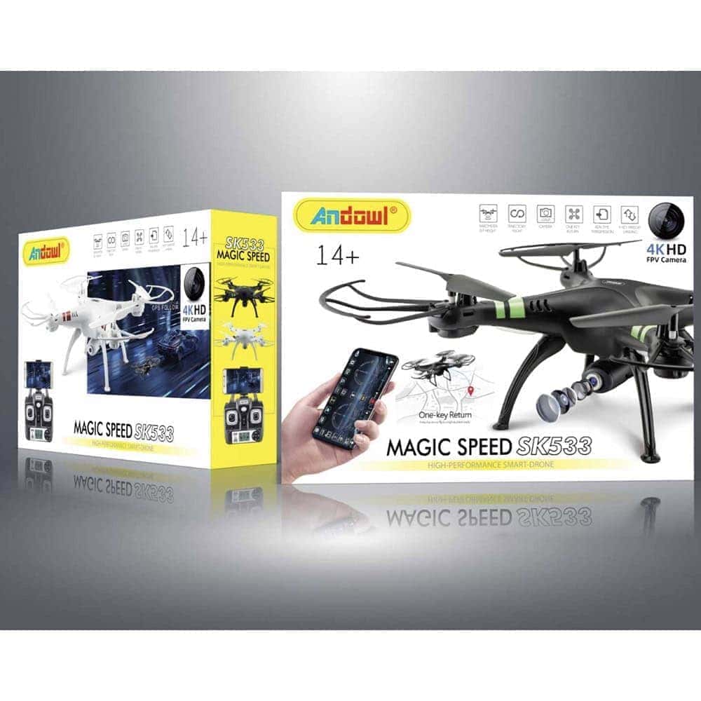 Drona Andowl SK533 detine o camera care poate captura videoclipuri Ultra HD (4K). Acesasta vine cu un controler de zbor si poate fi conectata la un telefon mobil sau o tableta pentru functionalitate suplimentara.