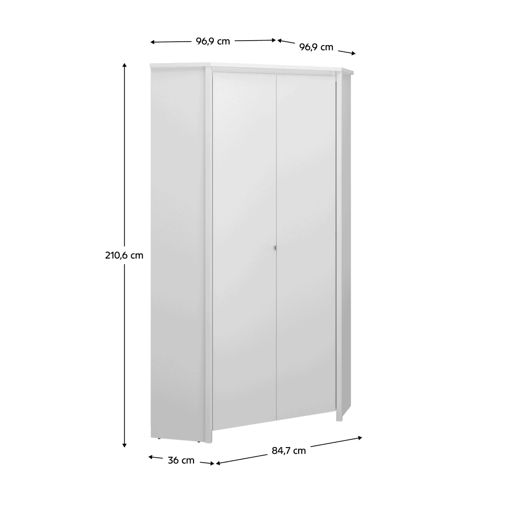 Material: PAL melaminat / muchii din ABS Culoare: albă Dimensiuni (LxAxÎ): 84,7x36x210,6 cm Grosimea materialului: 1,6-3,2 cm Două uşi Spaţiu de depozitare 2x Zone pentru umeraşe Capacitatea de încărcare a barei pentru umeraşe: 15 kg Zonă cu rafturi Capacitatea de încărcare a fiecărui raft: 5 kg Picioare din plastic Design modern Vă recomandăm să ataşaţi mobilierul de perete Livrat dezasamblat