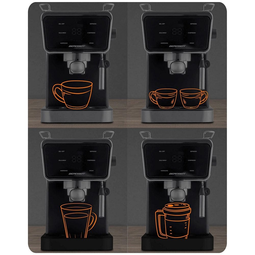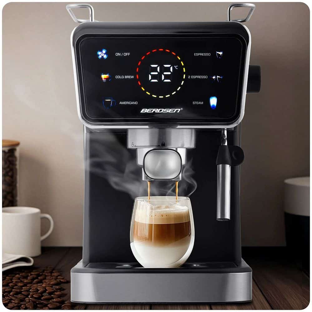 Espressor cu piston Berdsen, cafea macinata, presiune de 20 bar, indicatori LED, ecran tactil, termometru incorporat, buton de control al emisiilor de abur, spumator de lapte, 1350 W
