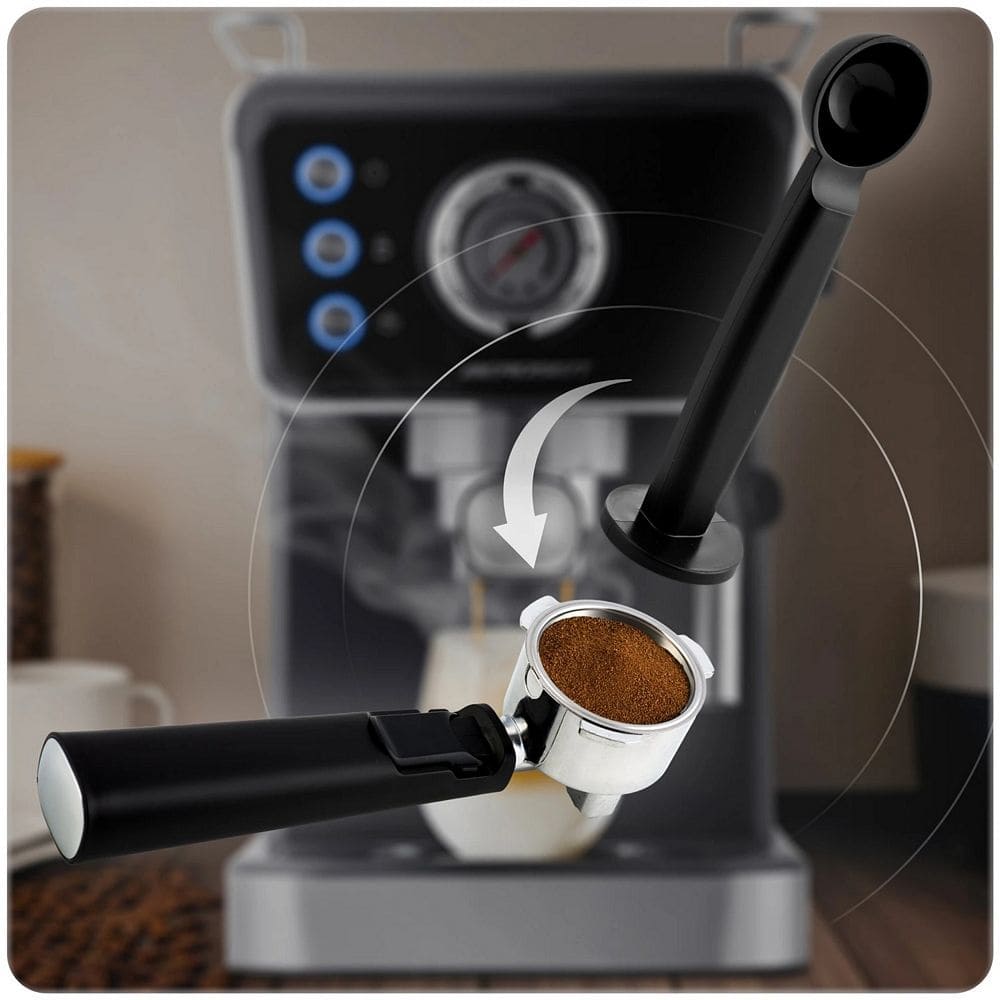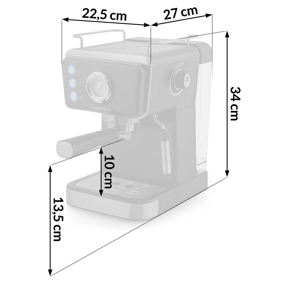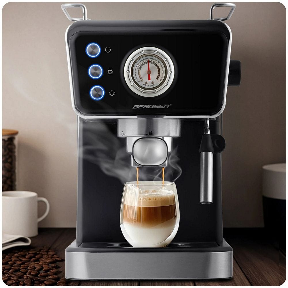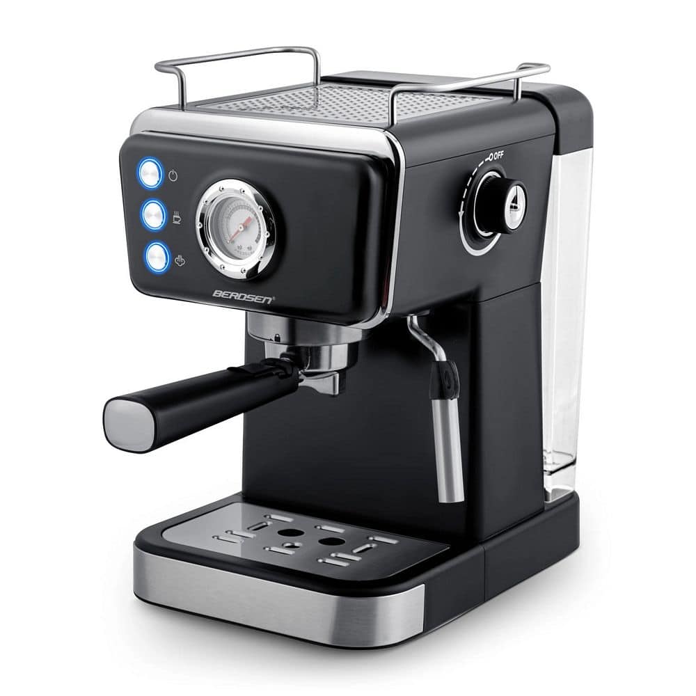 Espressor cu piston Berdsen, cafea macinata, presiune de 20 bar, pornit/oprit, termometru incorporat, spumator de lapte, rezervor de apa 1,5 l, 1350 W, negru