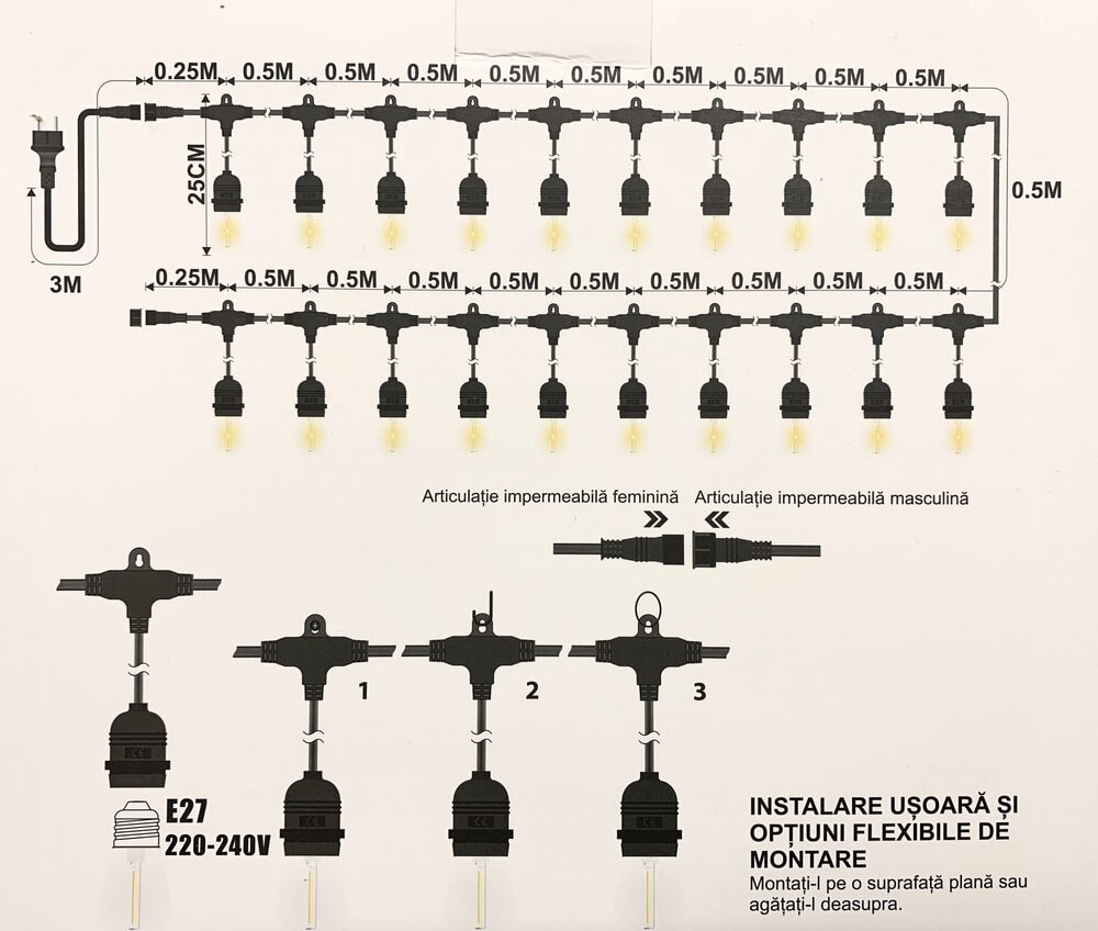 Lungimea ghirlandei este de 10 m+3m cu 20 pendule cu becuri.