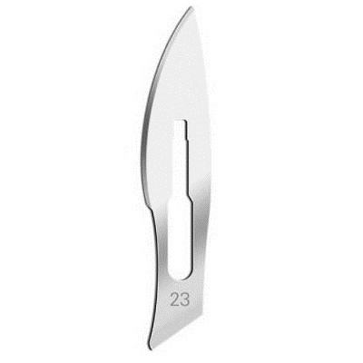 Lame bisturiu din otel-carbon nr. 23. Lamele de bisturiu sunt sterile, ambalate individual in folie de aluminiu,