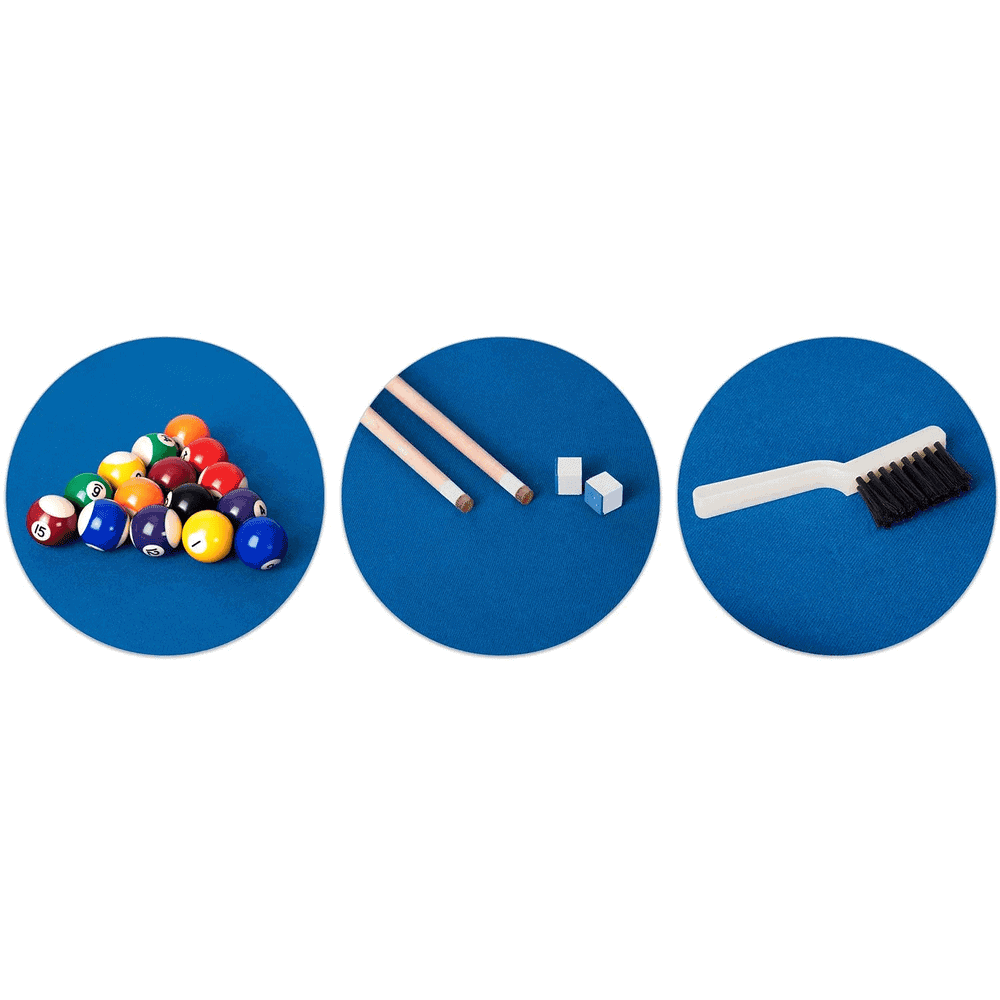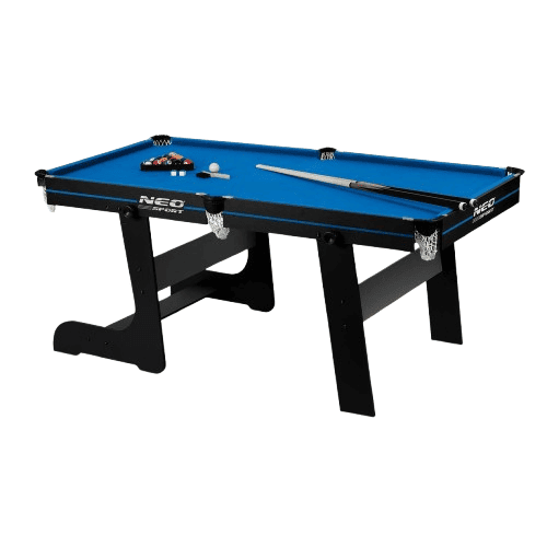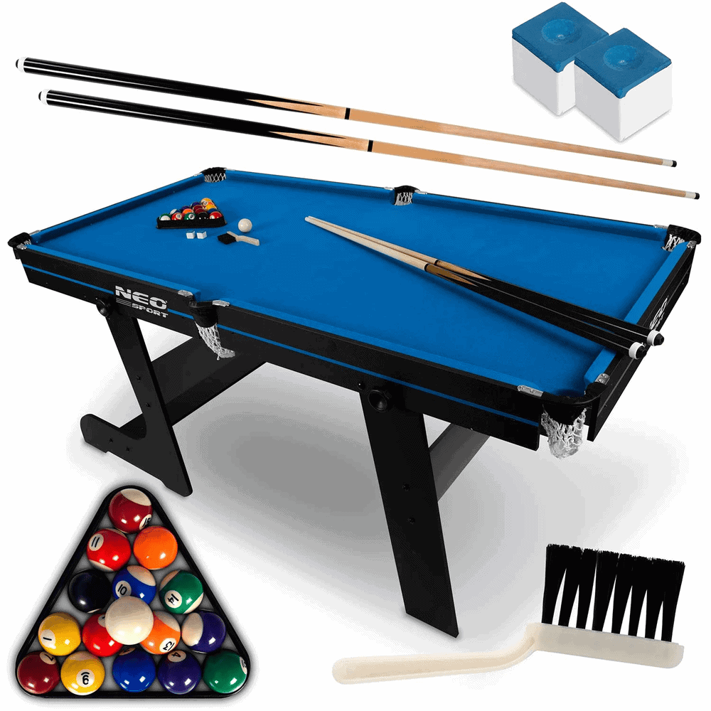 Masa de biliard, 16 mingi din cel mai durabil material, doua tacuri de lemn rezistente, triunghi si doua cuburi de creta, pliabila, 183 x 92 x 81 cm, neagra si albastra
