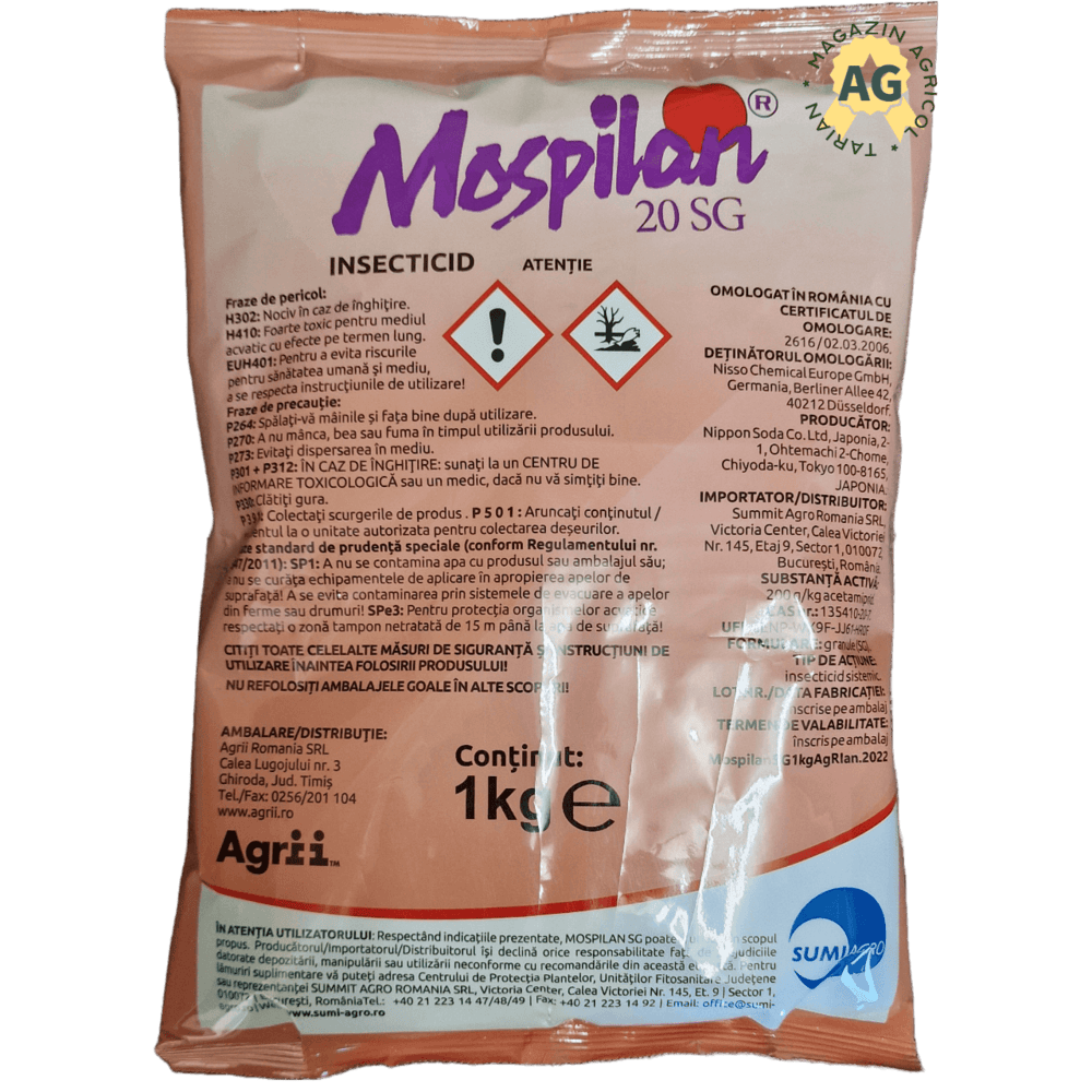 - MOSPILAN 20 SG combate foarte bine un spectru larg de daunatori din principalele culturi agricole. Pentru marirea spectrului de combatere si evitarea crearii formelor rezistente se vor alterna tratementele cu insecticide din alta grupa chimica ( ex. Fury 10 EC).