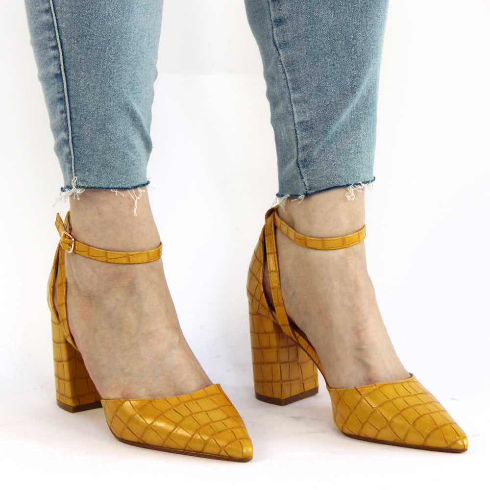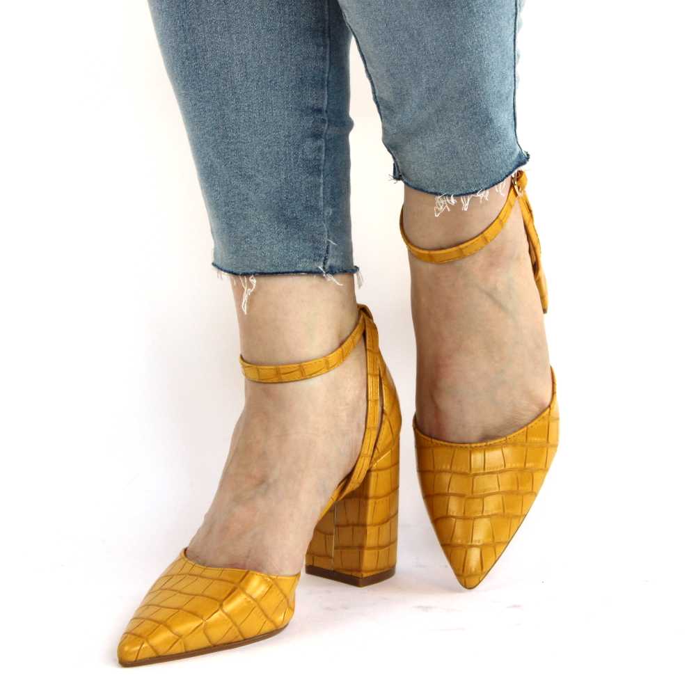 Pantofi de dama cu tocul gros, piele sintetica R1L1420-19-YELLOW