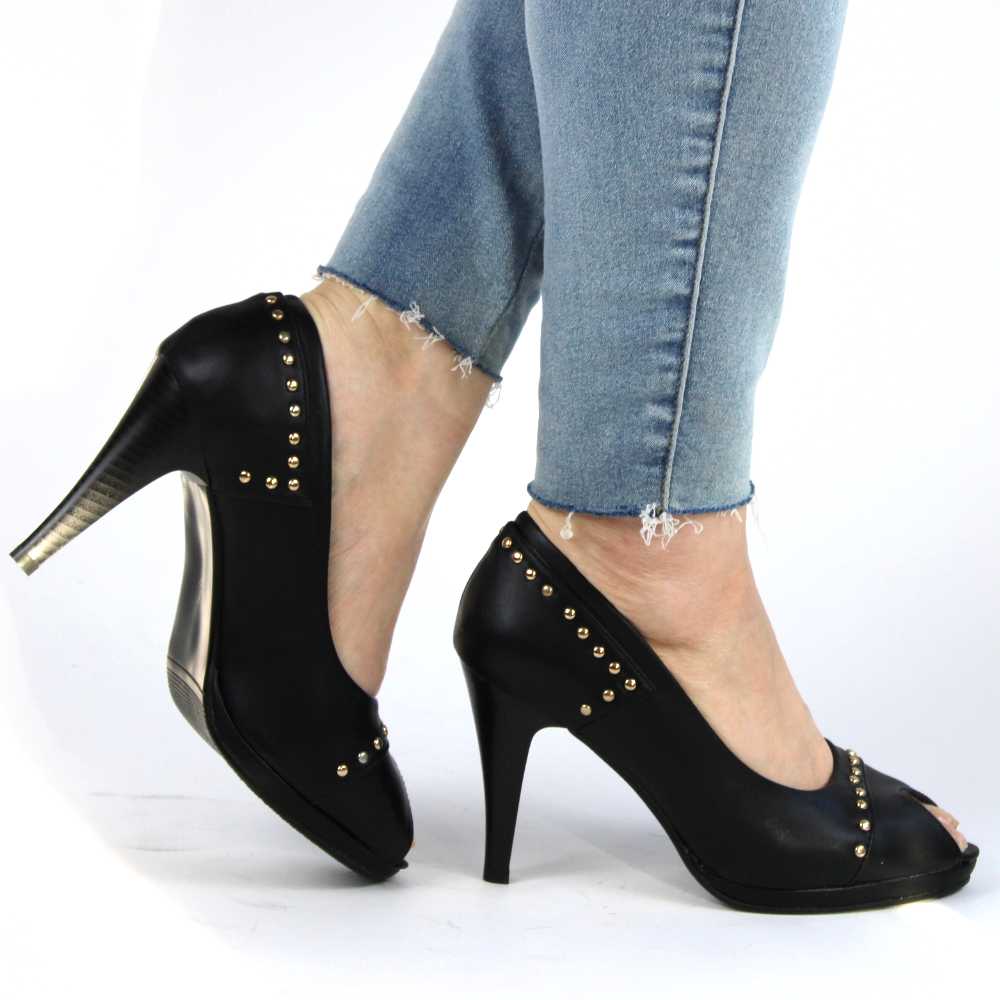 Confecționați din piele ecologică de calitate superioară, pantofii se remarcă prin designul decupat ce adaugă un plus de eleganță și rafinament. Decorurile cu ținte aurii aplicate discret îl fac ușor de asortat cu diverse accesorii și bijuterii.