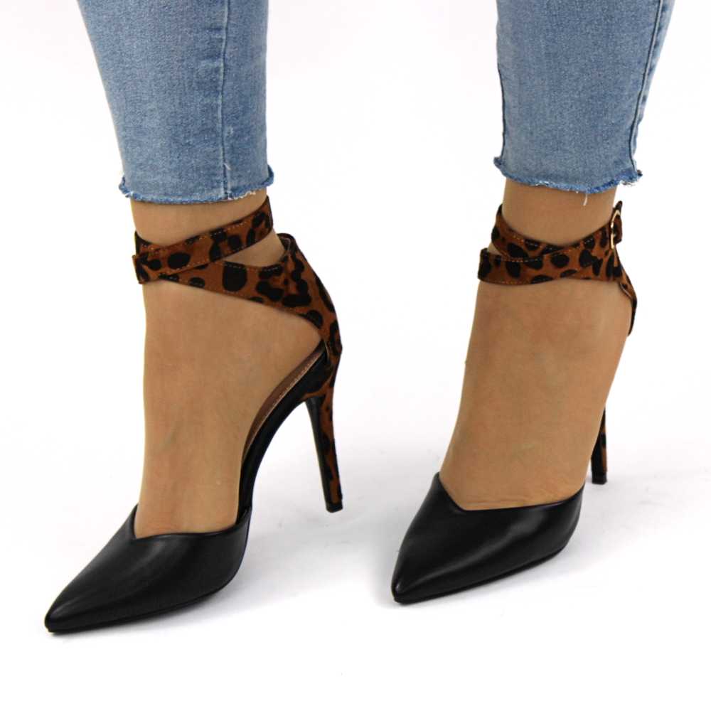 Pantofi de dama stiletto, cu barete pe glezna animal print 8384-BLACK