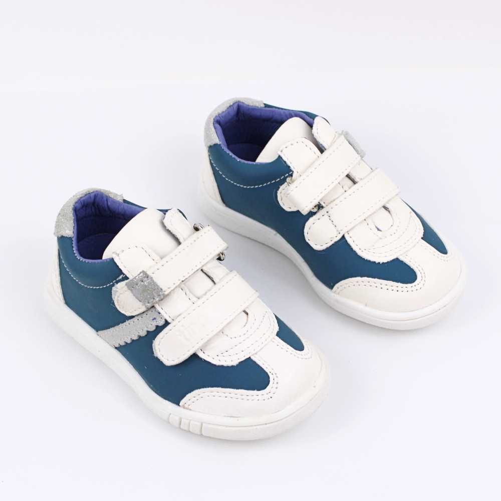 TABEL DE MASURI : M 24 : 16 cm M 27 : 17.5 cm M 25 : 16.5 cm M 28 : 18 cm M 26 : 17 cm M 29 : 18.5 cm Pantofi sport , pentru copii , din piele naturala , cu talpa cusuta 1839-BLEU/ALB/MC Confectionati din piele naturala , interior si exterior Inchidere cu barete cu arici PRODUS IN ROMANIA !
