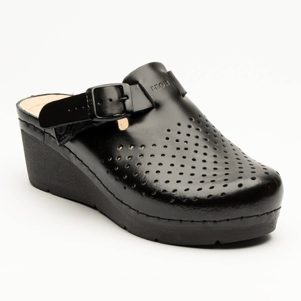 Saboti medicali, de dama, din piele, negru, Leon 1000 Modelul Leon 1000 reprezintă o alegere rafinată și confortabilă pentru femeile profesionale din domeniul medical, estetică, HoReCa sau servicii de curățenie. Cu un finisaj elegant și un design ergonomic, acești saboți combină funcționalitatea cu un plus de stil feminin. Sabotii Leon 1000 sunt proiectați pentru femeile care caută un mix între eleganță și confort. Construcția din piele naturală la exterior și interior garantează durabilitate și o bună respirabilitate. Branțul interior cu burete de memorie asigură amortizare și suport chiar și după ore întregi de stat în picioare. Talpa flexibilă din poliuretan, cu design ergonomic și antiderapant, oferă stabilitate și siguranță. Bareta reglabilă permite ajustarea ideală fiecărui picior. Disponibili în mărimi de la 36 la 41, acești saboți reprezintă o soluție completă pentru un confort de lungă durată și estetică profesională. Caracteristici: Culoare: negru Partea superioară are perforații discrete care facilitează ventilarea piciorului, iar bareta reglabilă completează fixarea personalizată. Exterior & interior: piele naturală 100%, respirabilă și durabilă, ce asigură confort pe termen lung. Branț cu burete de memorie cu efect masant – modelează conturul piciorului și atenuează presiunea, ideal în perioade de stat îndelungat în picioare. Talpă din poliuretan flexibil, cu formă anatomică ce susține mersul natural. Talpa are un toc discret de aproximativ 5 cm pentru un plus de susținere fără risc de oboseală. Mărimi disponibile: 36-41 Beneficii: Branțul moale și confortabil dinamizează confortul chiar și în cele mai aglomerate zile de muncă. Perforațiile din piele permit circulația aerului, reduc transpirația și elimina riscul de disconfort. Talpa ergonomic‑anatomică distribuie uniform greutatea corpului și previne durerile articulare. Bareta reglabilă oferă ajustare precisă și stabilitate personalizată. Recomandați pentru: personal medical, asistente, infirmiere, terapeuți angajați din HoReCa centre de estetică, saloane grădinițe, școli sau centre de îngrijire laboratoare sau echipe de curățenie.
