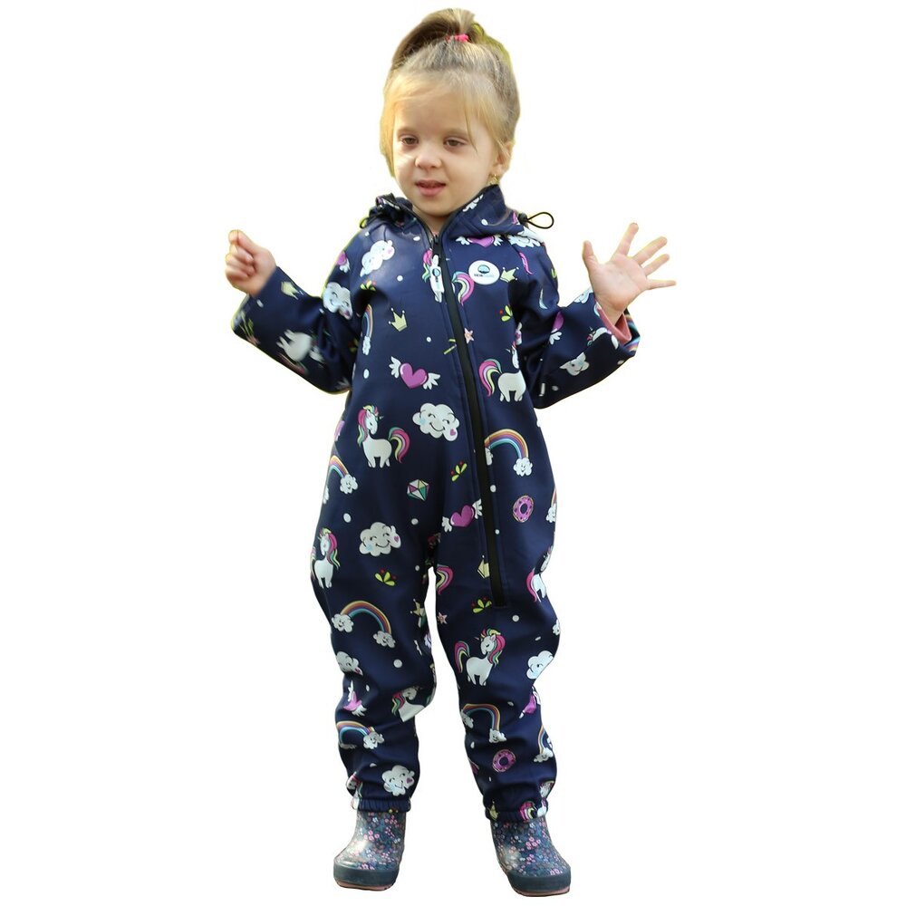 Salopeta impermeabila pentru copii Kidscare, cu protectie la vant si ploaie cu imprimeu Unicorni Navy