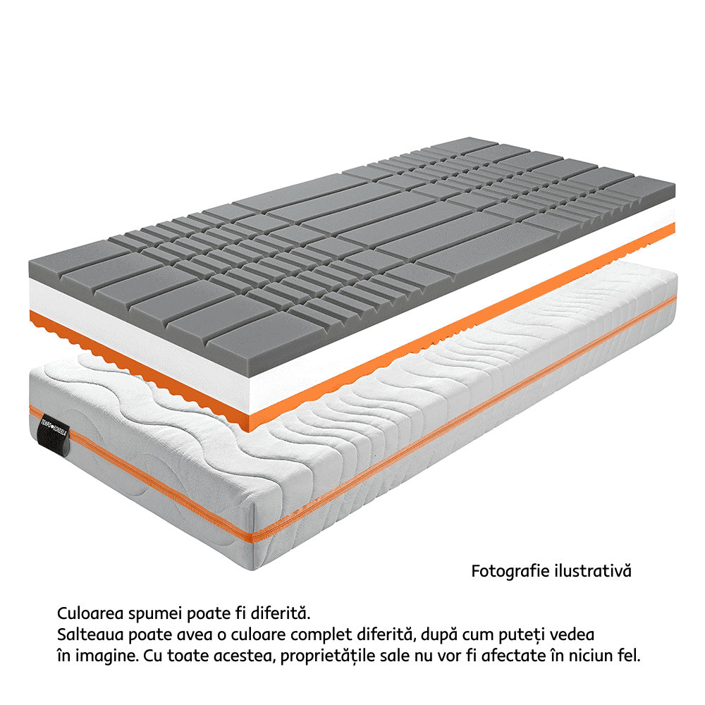 Saltea antiescare BE KELLEN, Material: spumă poliuretanică Husă: alb-zăpadă Dimensiuni (lxL): 90x200 cm Înălţimea saltelei: 16 cm Duritate: mediu nr. 3/mediu dur nr. 4 Greutate susţinută: 110 kg O saltea cu duritate medie O saltea cu duritate medie (gradul de duritate T3) se poate adapta cel mai bine la culcare, nu creează contrapresiune şi menţine poziţia coloanei vertebrale. Este potrivit pentru persoanele care cântăresc între 70 şi 120 de kilograme. Cu şapte zone anatomice Cu umplutură respirabilă din fibre PES 200 gr/m2, cu fermoar Antidecubitus Saltea sandwich Cu două feţe Recomandat pentru somieră lamelară Husă CHLOE AKTIV Husă cu certificat OEKO-TEX STANDARD Antibacterian Anticăpuşă Cu fermoar Spălare la temperatura de 60°C Produs slovac de calitate. Vă recomandăm o somieră flexibilă cu lamele (pretensionate, lamele flexibile) Distanţă între lamele max.6 cm Grosimea lamelei 0,5-1 cm Culoarea spumei poate fi diferită. Salteaua poate avea o ...