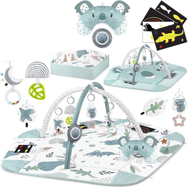 Salteluta interactiva, material moale, 7 jucarii multifunctionale, laturile ridicate, doua fete, pliabil, imprimeu cu koala