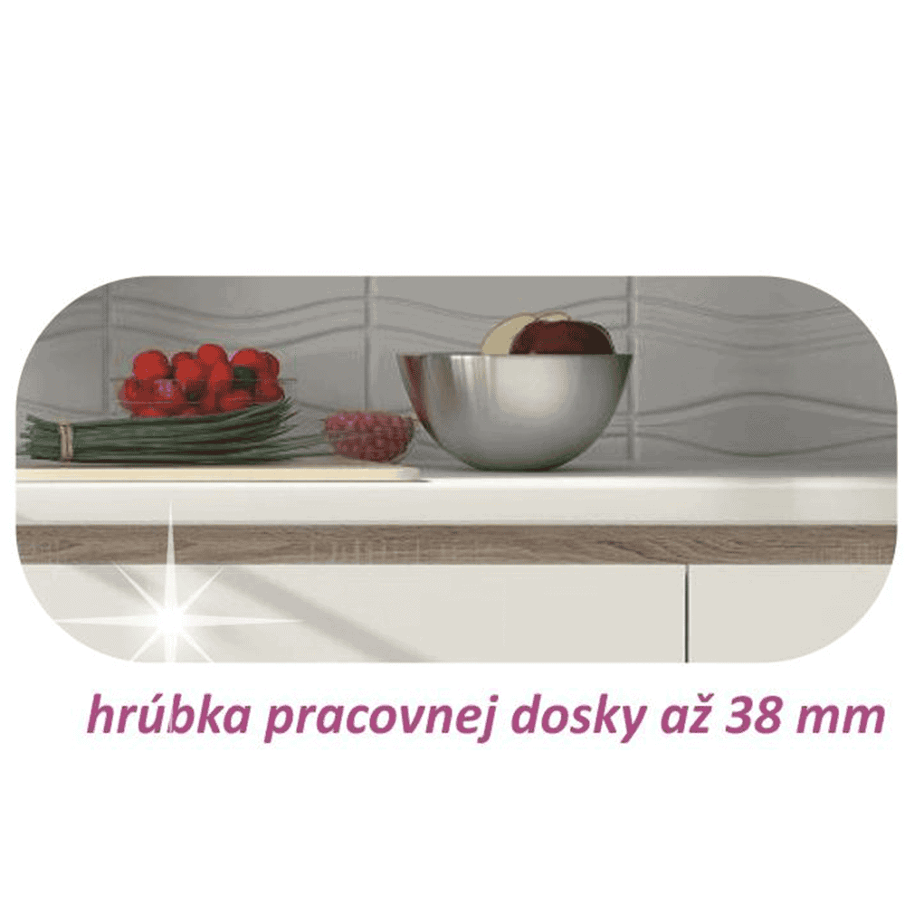 Ansamblu bucătărie de bază LINE NEW 2,6 m în design şi stil modern Material şi culoare: PAL laminat de înaltă calitate în designul uşilor: corp alb/stejar sonoma. Grosimea blatului de lucru este de până la 38 mm. Grosimea materialului: 16 mm Puteţi cumpăra diferite unităţi de dulapuri. Toate dulapurile inferioare sunt livrate cu blat de lucru şi cu şipcă inferioară, cu excepţia dulapurilor D80ZL şi D60KU. Puteţi cumpăra chiuvetă S/D. Se livrează demontat. Puteţi cumpăra o chiuvetă universală S/D LAY ON. Puteţi cumpăra blatul de lucru de 38 de mm la 339,-/m.