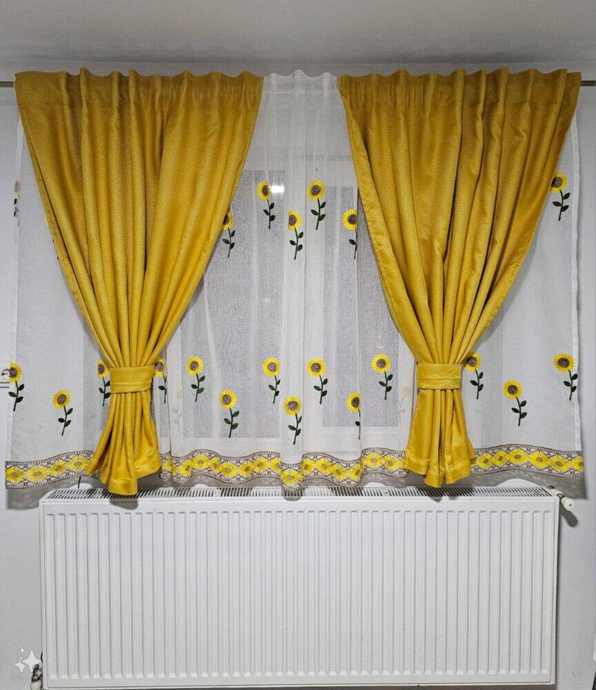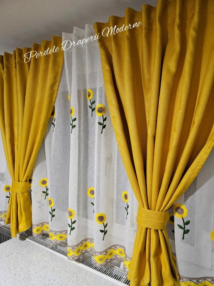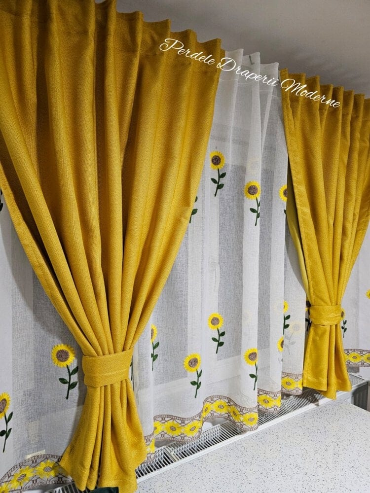 Transformă-ți casa într-un spațiu plin de bucurie și lumină cu acest set de perdea și draperie cu model floral FLOAREA SOARELUI, GALBEN!