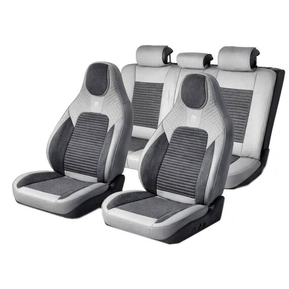 Set huse scaune auto Premium, model BLAZE Elite, design Sportiv, universale, ergonomice, Piele Ecologica cu insertii textile, culoare Gri/Crem