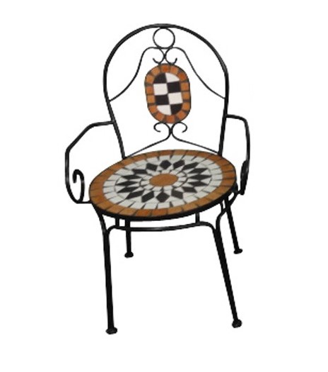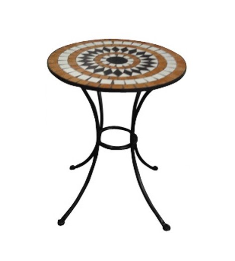 Setul contine o masa rotunda si doua scaune cu spatar, fixe, cu structura fabricata din otel acoperit cu o pelicula de vopsea completat de bucatele de mozaic cu motiv geometric.