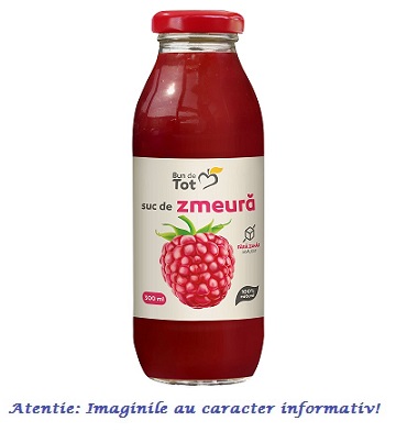 Sucul natural de zmeura potolește setea și alina pofta de dulce, cât ai zice Bun de Tot. Din fructe de zmeur proaspăt presate, îndulcit cu suc de struguri și fară zahar, conservanți sau aditivi alimentari, sucul asigura porția zilnica de vitamine, că tu să te bucuri de țoață savoarea naturii și de gustul unic al zmeurii.