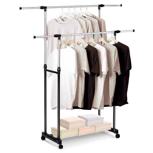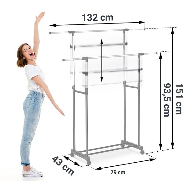 Suport mobil pentru haine DacEnergy©, cu roti, usor, incapator si stabil, spatiu pentru incaltaminte, inaltime reglabila, 151x 43x 79 cm, negru si argintiu