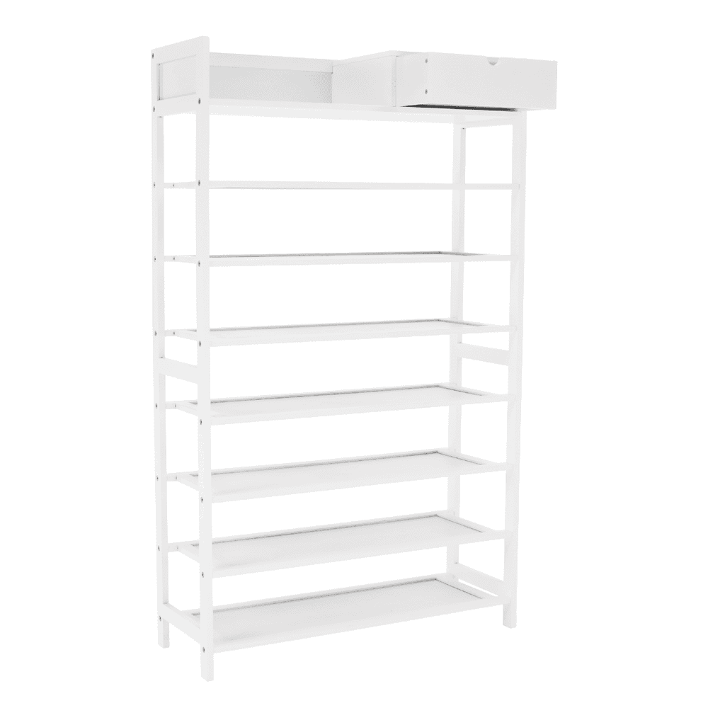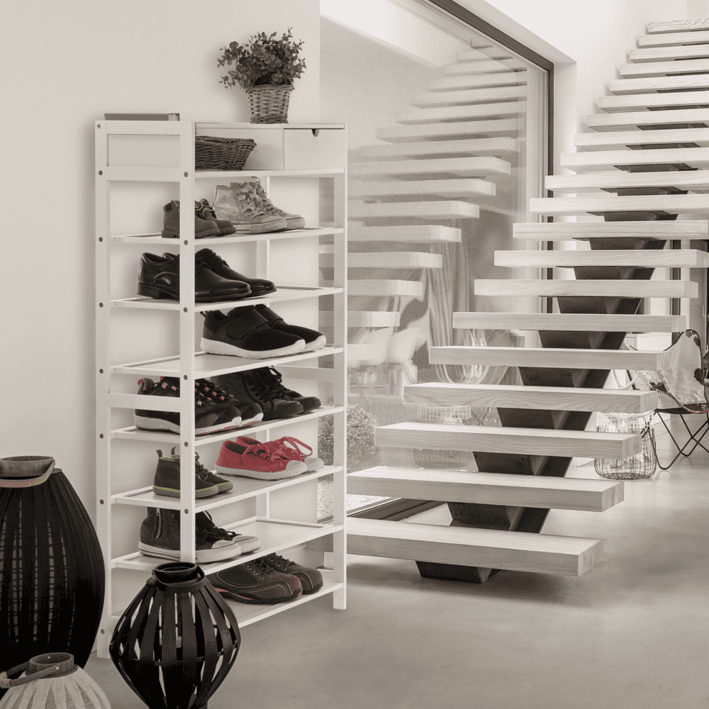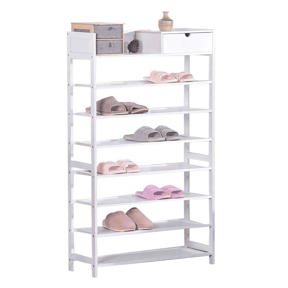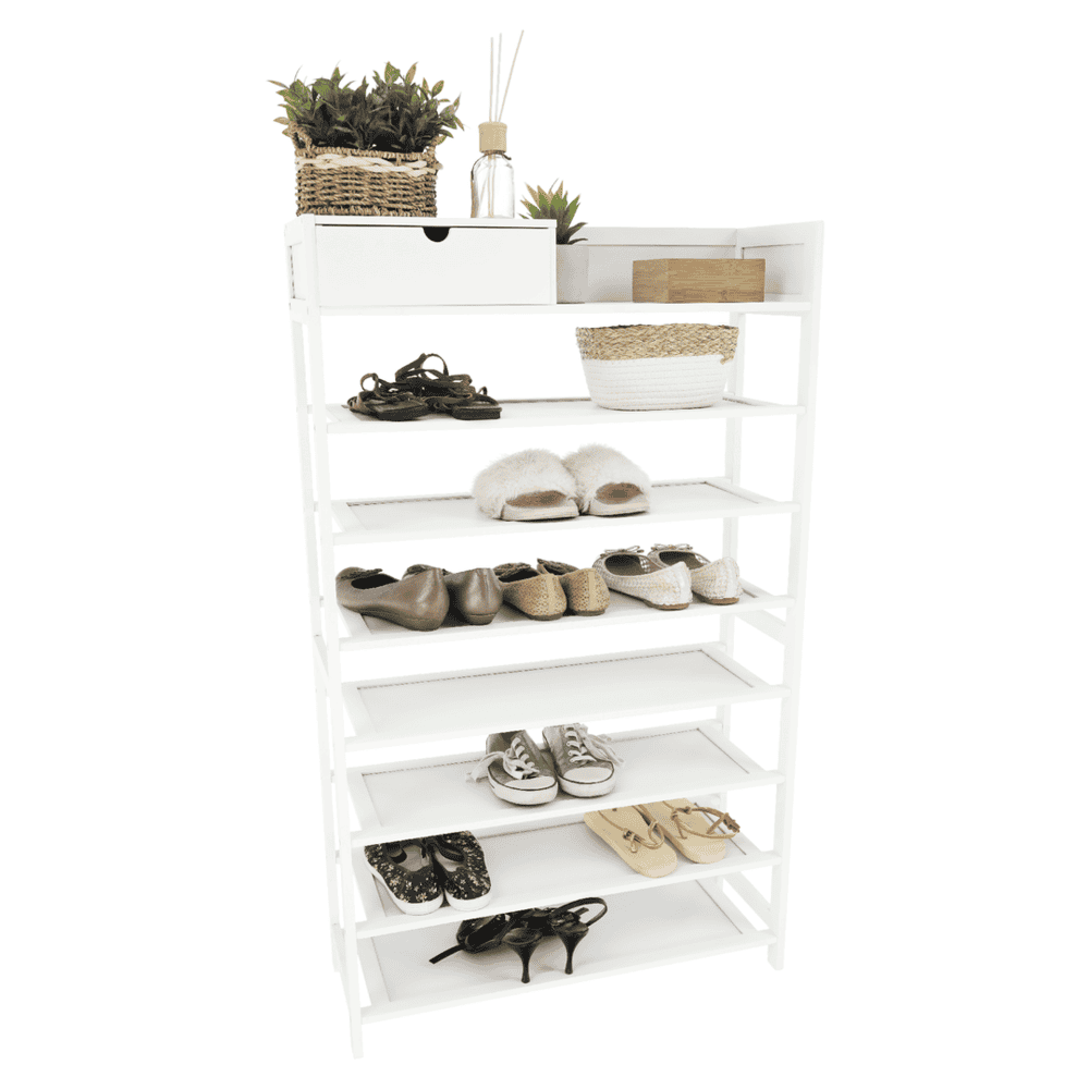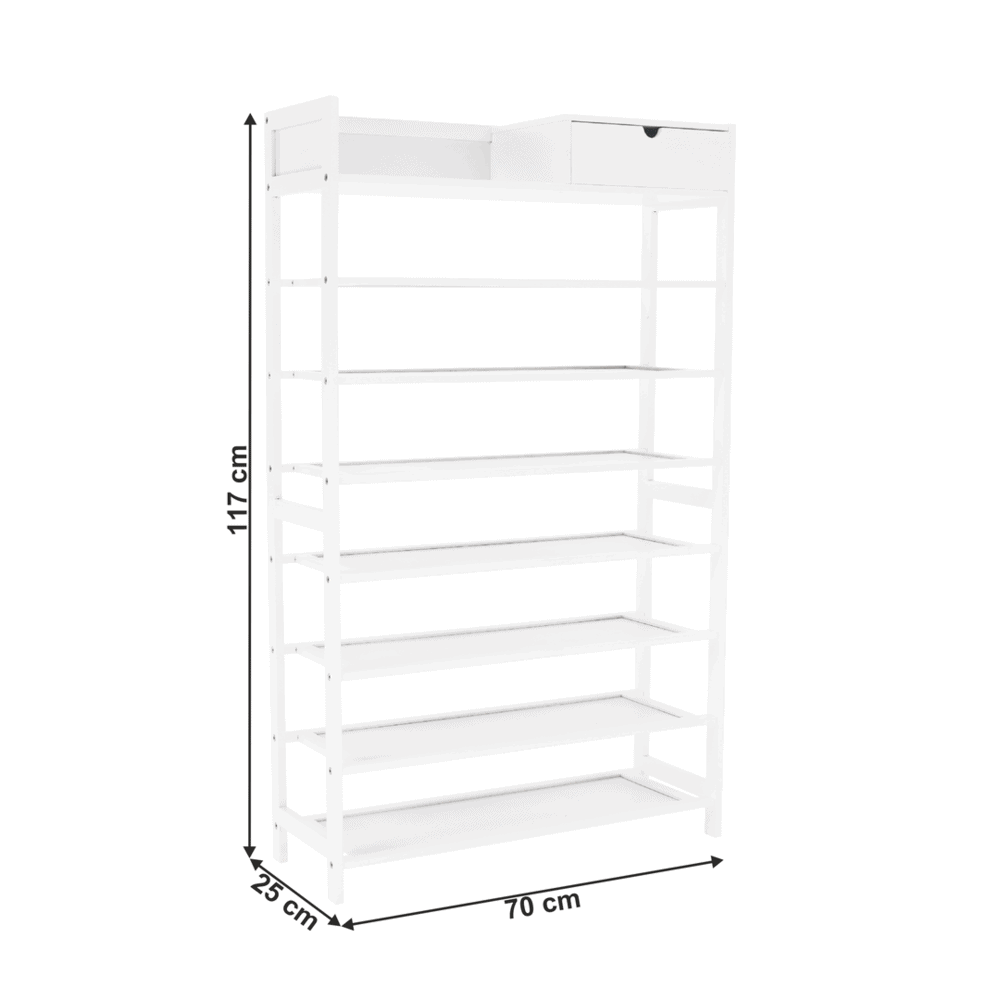 Material: bambus lăcuit Culoare construcţie: alb Dimensiuni (lxxxh): 70x25x117 cm Cutie de pantofi pe 7 rânduri Spaţiu pentru organizare în hol, coridor sau dulap Raft simplu şi practic pentru pantofi Rafturi deschise şi un sertar Design natural Instalare uşoară Întreţinere uşoară Capacitate de încărcare: 50 kg (sarcină uniformă) Livrat nemontat