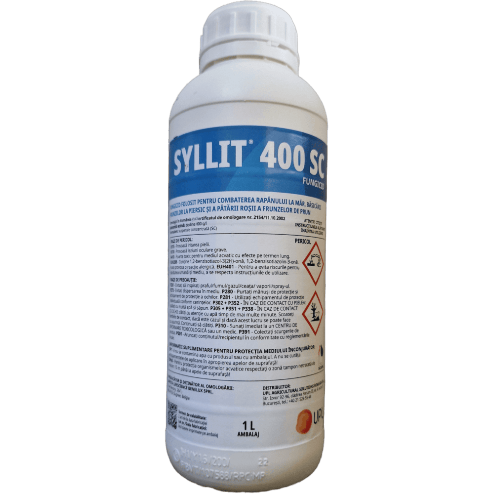 Syllit 400 SC, fungicid specific folosit pentru combaterea rapănului la Măr, bășicării frunzelor la Piersic și a pătării roșii a frunzelor de Prun