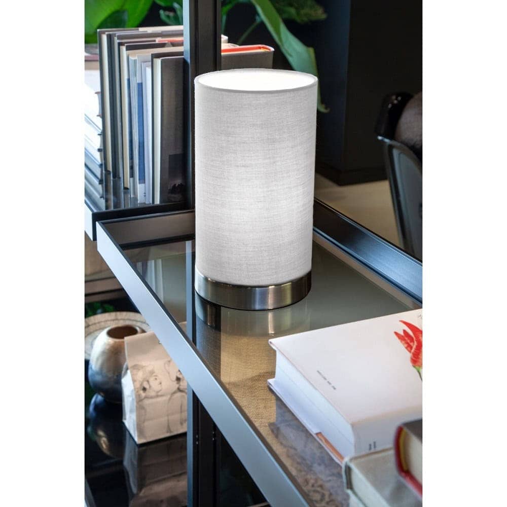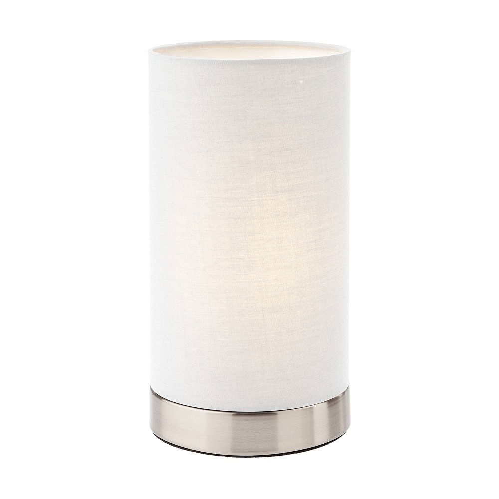 Veioza Tube 01-3144 este un corp de iluminat pentru interior, cu structura din metal finisat nichel mat si abajur textil de culoare bej pe suport din PVC alb.