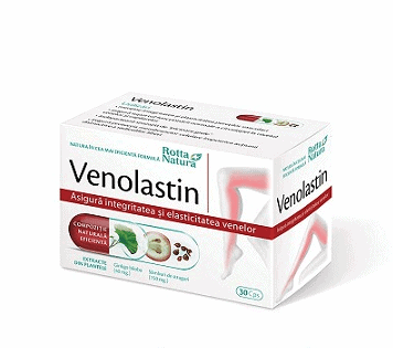 Venolastin este un complex natural eficient care asigură elasticitatea și integritatea pereților venelor. Asocierea extractului de Sâmburi de struguri și extractului de Ginkgo biloba, face din Venolastin un produs inovator care acționează în două direcții: una de ameliorare și îmbunătățire a tonusului sistemului vascular iar alta, de optimizare a circulației și de oxigenare a țesuturilor. El reduce permeabilitatea vasculară, menține elasticitatea venelor și are o acțiune antioxidantă de reducere a radicalilor liberi.