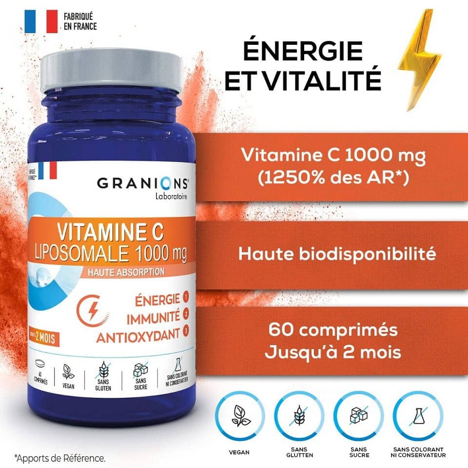 Vitamina C 1000 mg lipozomala 60 capsule - Granions Franta Tehnologia lipozomalaTehnologia lipozomala este una dintre nano-tehnologiile dezvoltate recent, care permite o absorbtie maxima a principiilor active si o mai buna directionare a acestora de catre corp, in locul unde este cea mai mare nevoieTehnologie lipozomala: prin microincapsularea vitaminei C in forma lipozomala, se evita degradarea prematura de catre enzimele digestive sau de catre mediul acid din stomac, cum se intampla la formele traditionale de vitamina C.Forma lipozomala este protejata si livrata eficient celulelor, iar organismul poate beneficia de o doza mai mare de vitamina C activa, ceea ce este crucial pentru intarirea sistemului imunitar si pentru lupta impotriva radicalilor liberi.Absorbtie maxima: datorita tehnologiei lipozomale, care permite o absorbtie maxima a principiului activ si o mai buna directionare a acestuia de catre corp, vitamina C este livrata eficient la nivel celular, in locul unde este cea mai mare nevoie, asigurand-se un grad foarte ridicat de absorbtie, o utilizare optima si o eficienta garantata.Concentratie ridicata: produsul contine o megadoza de 1000 mg de vitamina C, care protejeaza si intareste sistemul imunitar, cu ameliorarea simptomelor de raceala si gripa.Actiune antioxidanta puternica: rol esential in combaterea stresului oxidativ si protejarea celulelor impotriva radicalilor liberi, asociati cu un risc ridicat de aparitie a multor boli cronice. INGREDIENTE PRINCIPALE: vitamina C 1000mg/ 2 comprimateMOD DE ADMINISTRARE: pentru adulti 1 pana la 2 comprimate pe zi, pentru copii de la 10 ani 1 comprimat pe zi.Ambalaj: 60 comprimate