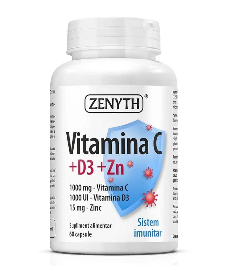 Vitamina C+D3+Zn – 60 capsule vegetale – Zenyth Vitamina C+D3+Zn de la Zenyth este un supliment alimentar complet, conceput pentru a susține sistemul imunitar și a proteja organismul în perioadele cu risc crescut de infecții.Formula sinergică reunește trei nutrienți esențiali – vitamina C, vitamina D3 și zinc – cu roluri fundamentale în apărarea naturală a corpului, funcționarea corectă a sistemului nervos, sănătatea oaselor și combaterea stresului oxidativ.Un aliat esențial pentru întărirea imunității și susținerea vitalității zilnice. Ingrediente active per capsulă: Vitamina C (acid ascorbic) – 180 mg (225% VNR)Vitamina D3 (colecalciferol, 1000 UI) – 25 μg (500% VNR)Zinc (citrat de zinc) – 10 mg (100% VNR) Beneficii: Susține funcționarea normală a sistemului imunitarContribuie la reducerea oboselii și extenuăriiProtejează celulele împotriva stresului oxidativAjută la menținerea sănătății pielii, părului și unghiilorSprijină buna funcționare a sistemului muscular și ososIdeal în sezonul rece, în stări de slăbiciune sau convalescență Mod de administrare: 1 capsulă pe zi, preferabil în timpul mesei. Caracteristici: Fără zahăr, lactoză, gluten sau aditivi sinteticiPotrivit pentru vegani și vegetarieniFormulă bioactivă, ușor de absorbitFabricat în România, conform normelor GMP Atenționări: Suplimentul nu înlocuiește un regim alimentar variat și echilibratA nu se depăși doza recomandată pentru consumul zilnicA nu se lăsa la îndemâna copiilor mici Ambalaj: Flacon cu 60 capsule vegetale – suficient pentru 2 luni de administrare continuă.