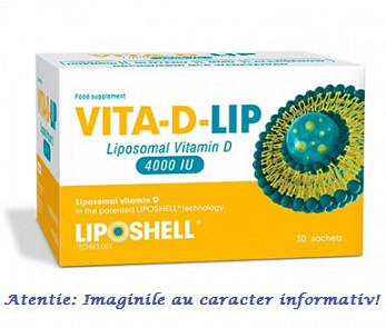 VITA-D-LIP - Vitamina D Lipozomala 4000 UI - contine o cantitate ridicata de vitamina D liposomala, obtinuta prin utilizarea tehnologiei brevetate LIPOSHELL, care o protejeaza de sucurile gastrice si ii permite transportul eficient in organism si-i asigura o mai buna absorbtie.