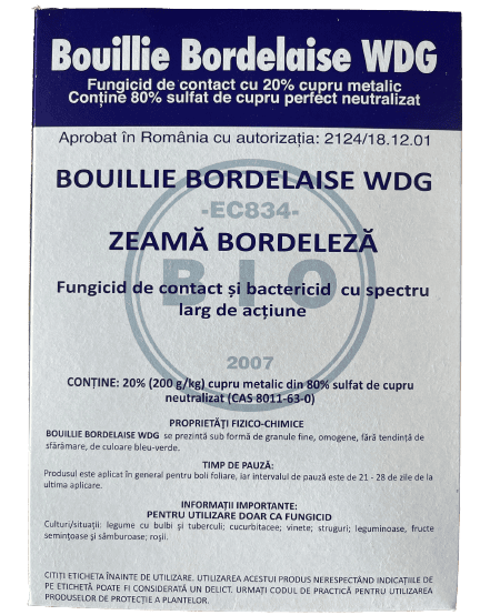 Zeama bordeleza (Bouille Bordelaise® WDG) este un fungicid de contact, pe baza de cupru, care controleaza mai multe boli cauzate de ciuperci si bacterii: alternarioza, rapan, foc bacterian, ciuruire, patare unghiulara etc.